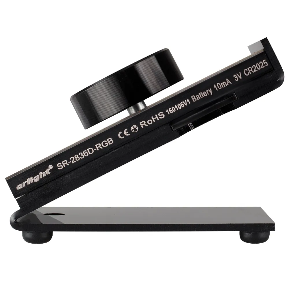 Оригинальная настольная поворотная панель для с/д RGB-лент (не подходит RGBW-лент). Цвет черный. Управление по радиоканалу. Питание - 3V батарея CR2025. Работает вместе с контроллером SR-1009x. Размер 100х65х74 мм