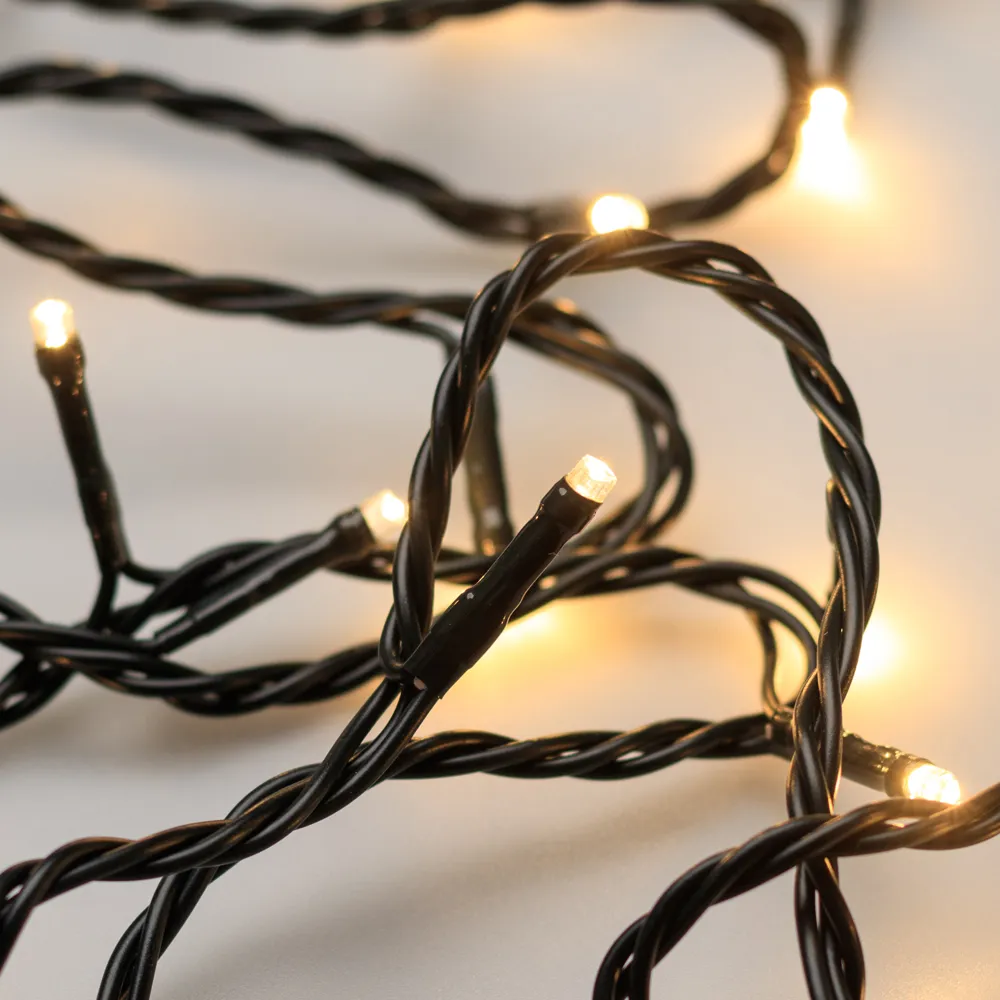 Светодиодная гирлянда НИТЬ серии HOME. Размер 5000 мм. Цвет светодиодов ТЕПЛЫЙ БЕЛЫЙ (3000 К), постоянное свечение. Провод из тёмно-зелёного ПВХ, диаметр 2 мм. 50 светодиодов размером 5 мм, прозрачный вогнутый колпачок. Напряжение питания 230 В, потребляемая мощность 3.5 Вт, степень пылевлагозащиты IP20. Аксессуар для подключения в комплекте.