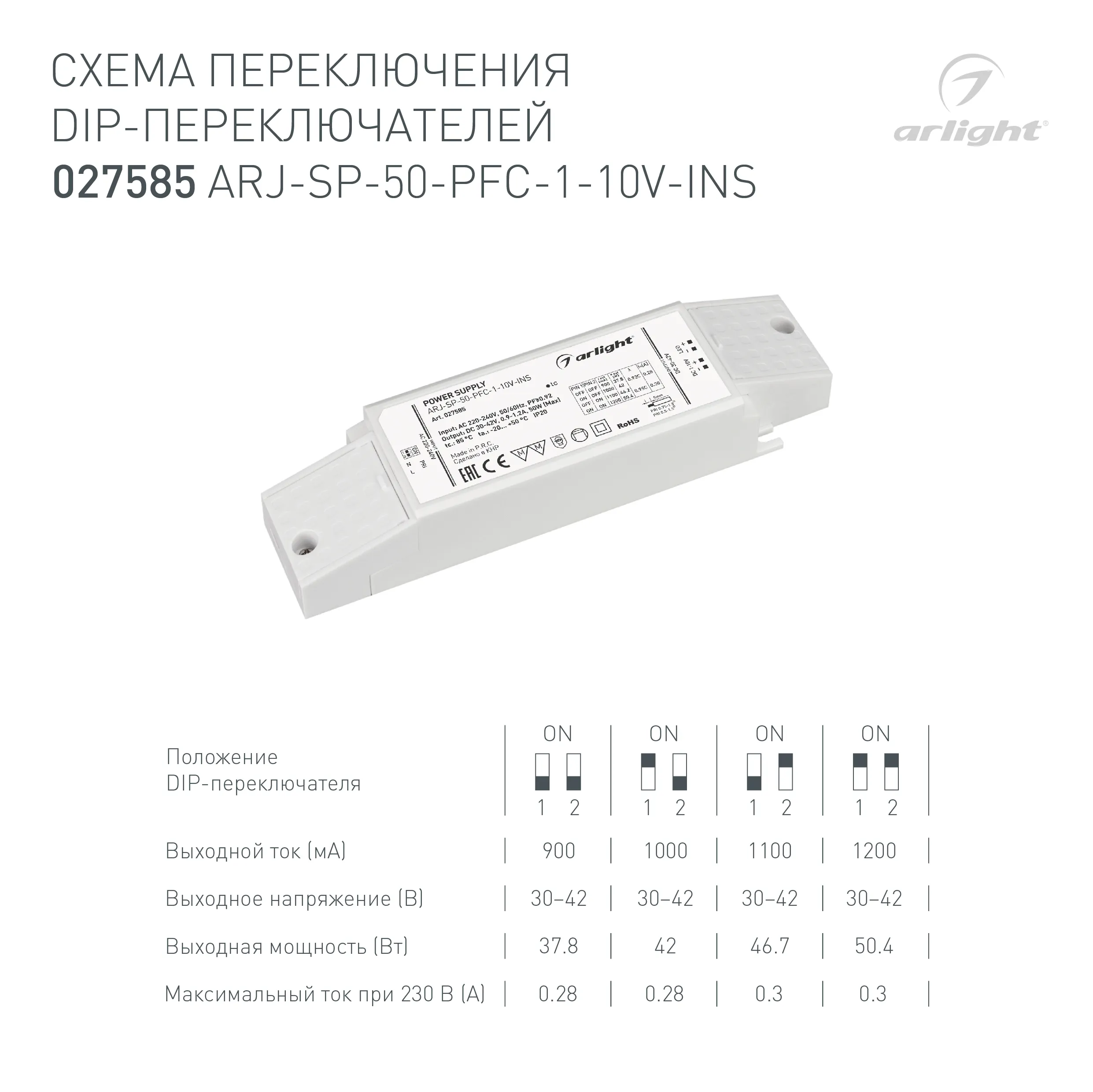 Блок питания ARJ-SP-50-PFC-1-10V-INS (50W, 900-1200mA) (Arlight, IP20 Пластик, 5 лет)