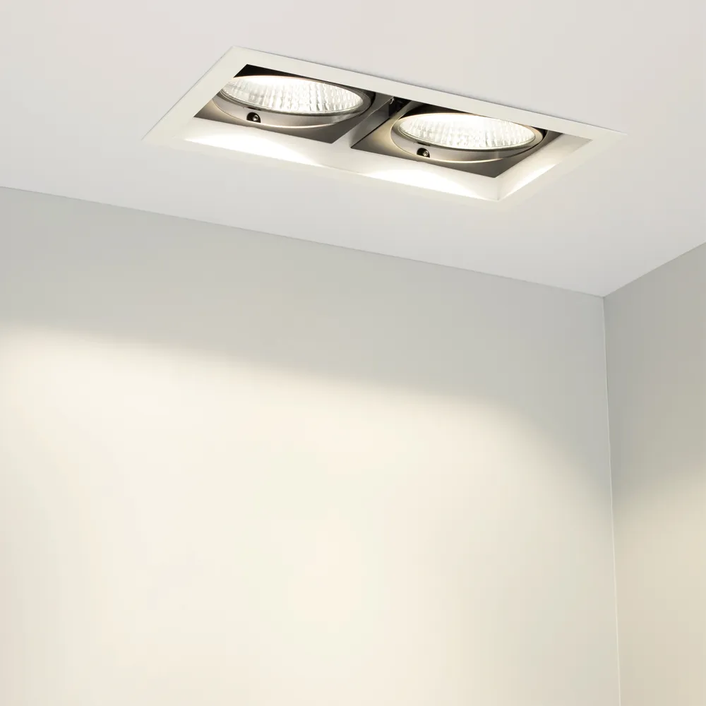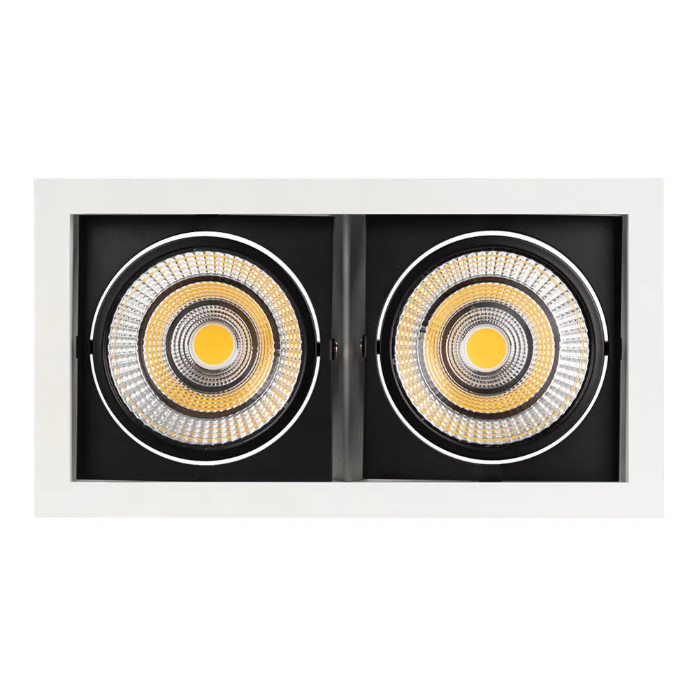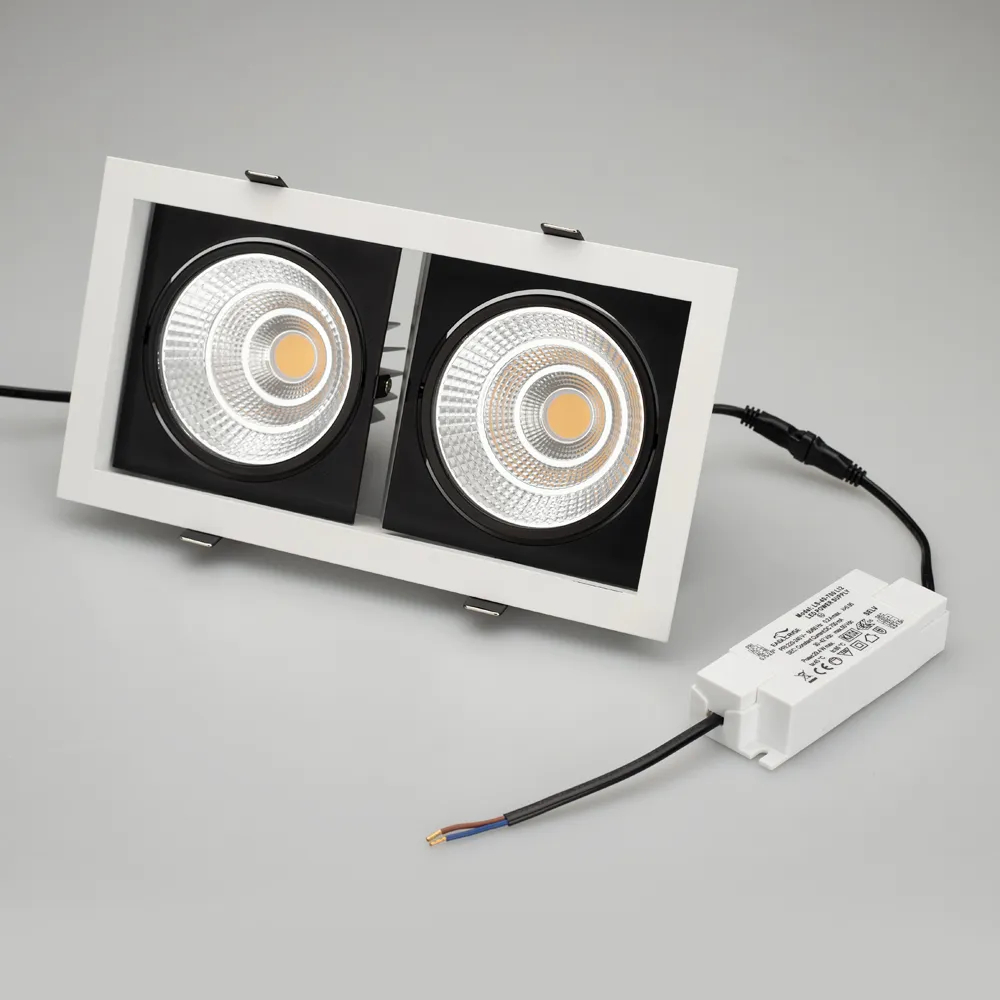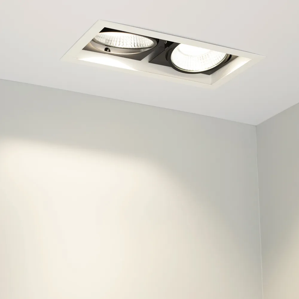 Встраиваемый карданный светильник. Угол 30° / 2x25Вт / ТЕПЛЫЙ 3000K / 4800лм, CRI>90. Корпус из белого алюминия с черными вставками. Питание AC220-240V, 50Вт, 700mA 30-42V, драйвер в комплекте, 2 шт. Размеры LxWxH: 283х152x100мм, отверстие для установки 265x135мм.