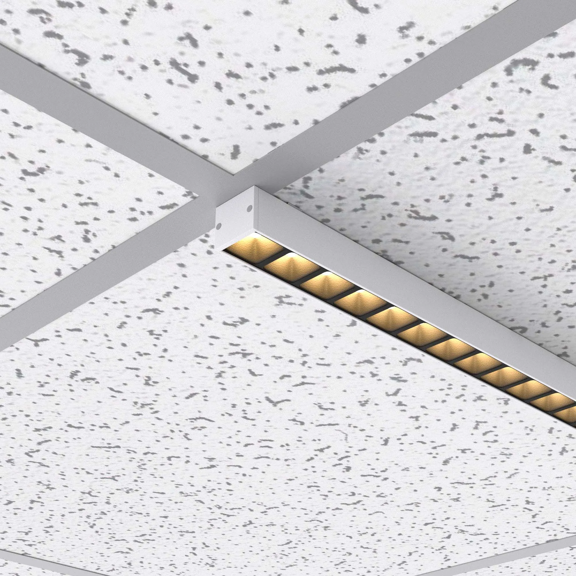 Светодиодный светильник для направляющих потолка Армстронг шириной 15 и 24 мм. Мощность 14 Вт, св. поток 1271 лм, 88 лм/Вт, дневной 4000K, CRI>80, угол 80°, напряжение питания 48 В. Белый квадратный корпус из алюминия, экран PC, степень защиты IP40. Размер: длина 600 мм, ширина 25 мм, высота 28 мм. Монтаж накладной. Драйвер поставляется отдельно.