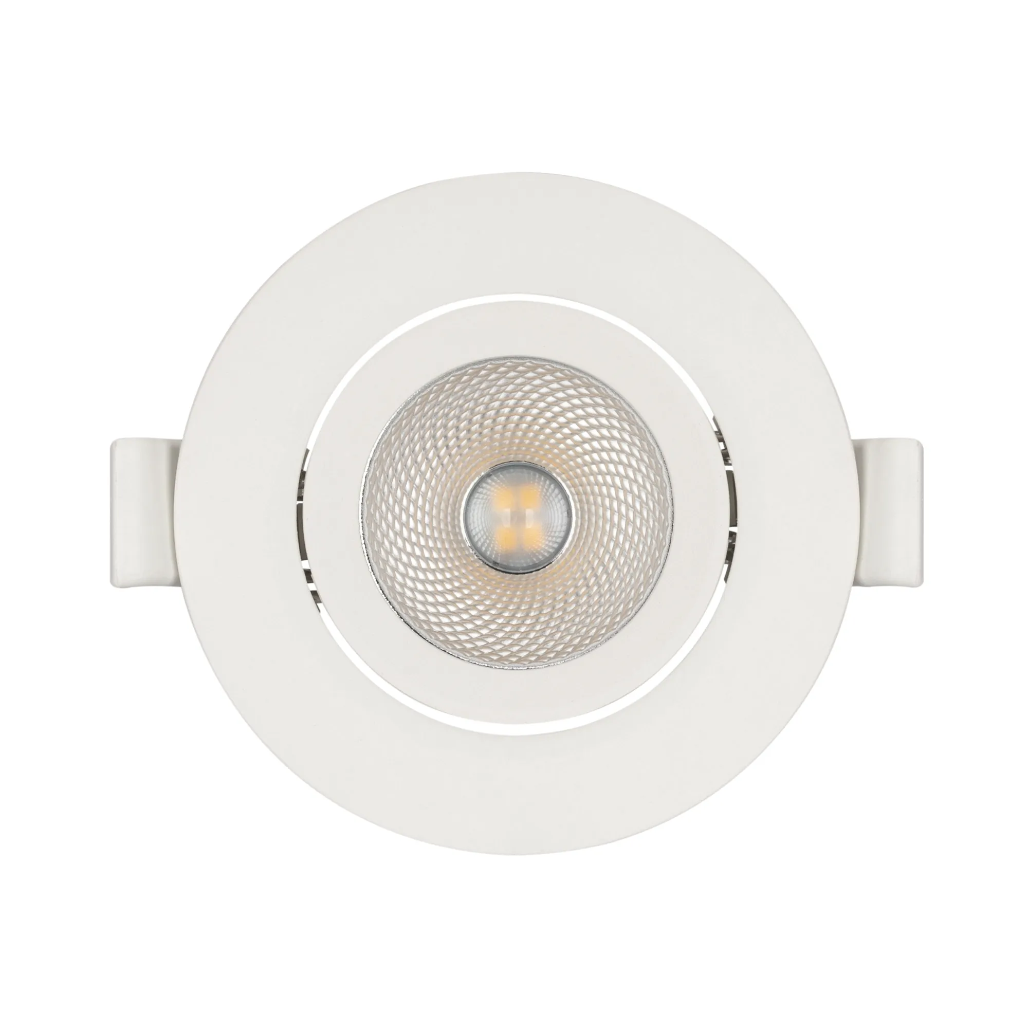 Встраиваемый поворотный светильник "даунлайт". Мощность 4.5 Вт, св. поток 400 лм, 89 лм/Вт, дневной 4000 K, CRI>80, UGR<19, угол 36°, напряжение питания 230 В. Белый круглый корпус из теплопроводящего полиамида, экран пластик, степень защиты IP20, угол поворота оси 30°. Размер: диаметр 80 мм, высота 37.5 мм. Монтаж встраиваемый, установочное отверстие диаметр 60-70 мм. Пульсация <2%.