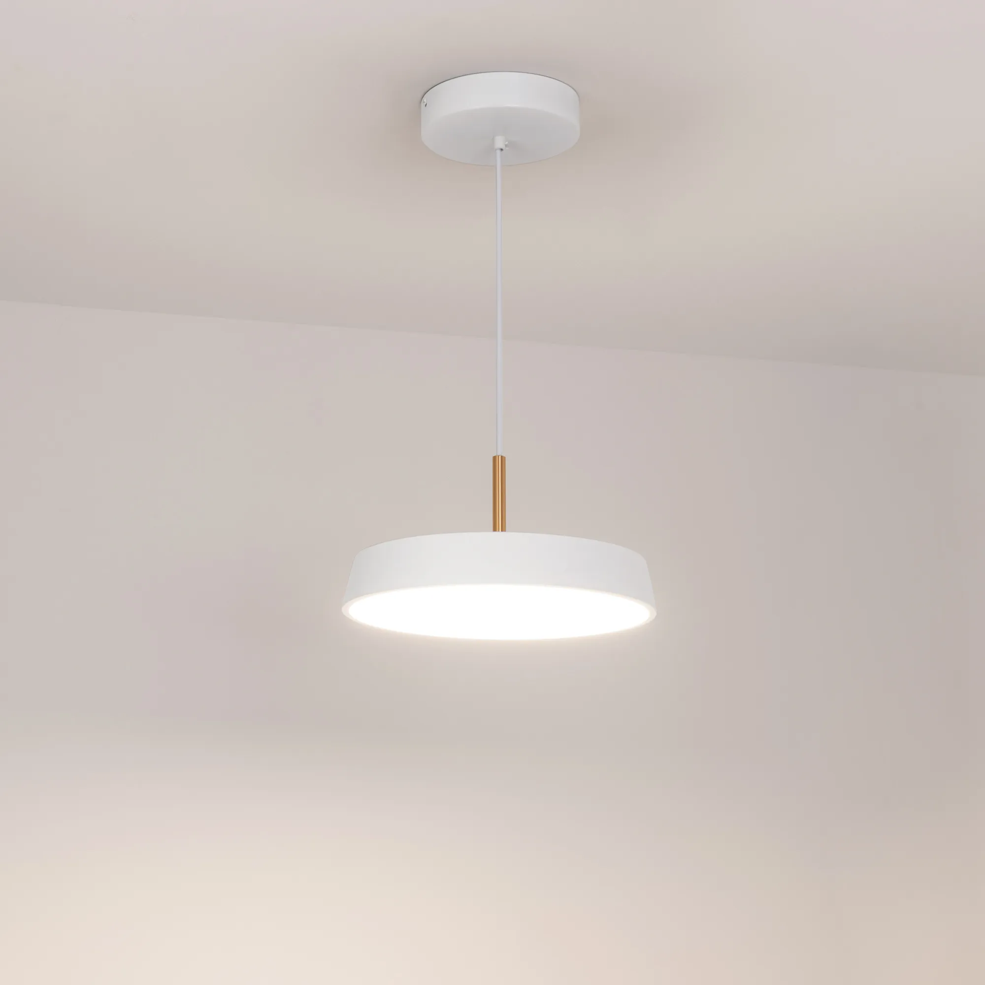 Подвесной светильник. Мощность 17 Вт, св. поток 1258 лм, 74 лм/Вт, дневной 4000 K, CRI>80, угол 120°, напряжение питания 230 В. Белый круглый корпус из стали, экран PMMA, степень защиты IP20. Размер: диаметр 300 мм, высота 50 мм, размер чаши: диаметр 160 мм, высота 35 мм. Монтаж подвесной, длина подвеса 1200мм. пульсация <5%.
