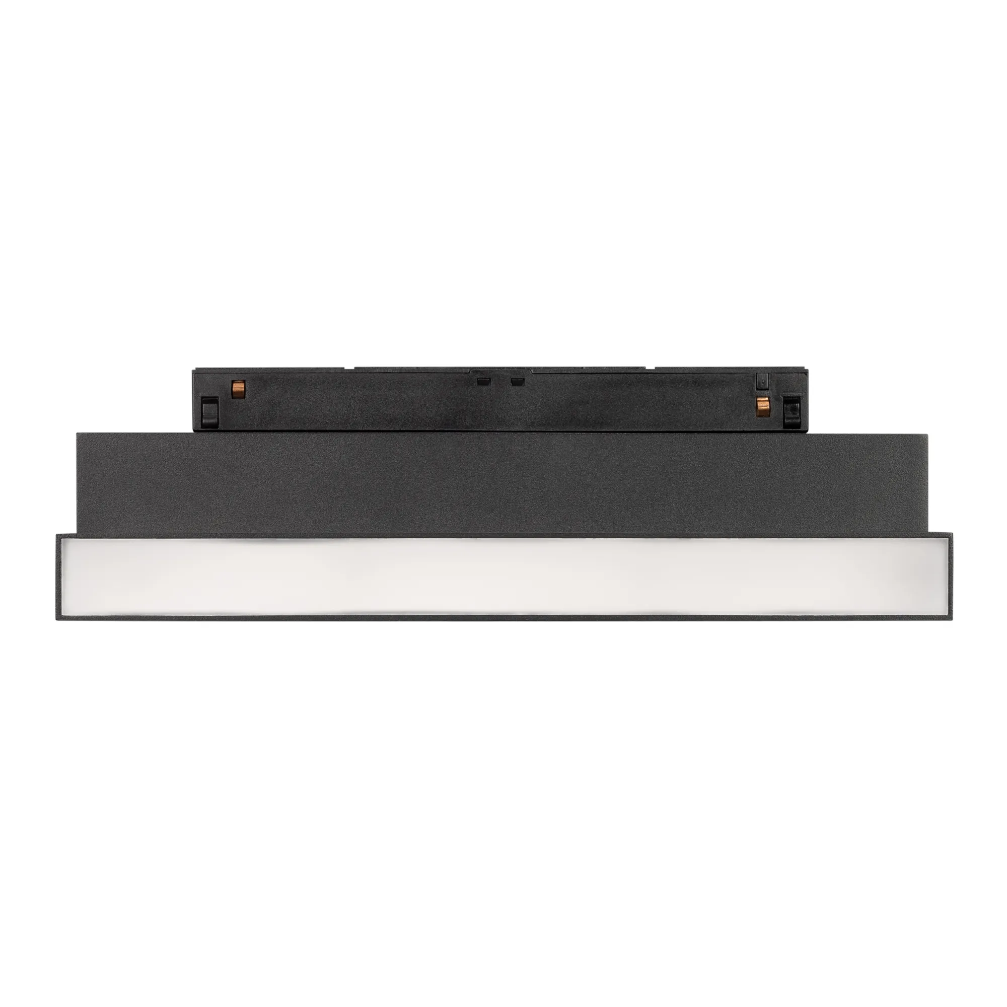 Светильник для магнитных треков MAG-ORIENT шириной 26 мм с управлением DALI. Мощность 12 Вт, св. поток 750 лм, 60 лм/Вт, теплый 3000 K, CRI>90, угол 80°, напряжение питания 48 В. Черный прямоугольный корпус из металл, экран поликарбонат, степень защиты IP20. Размер: длина 231 мм, ширина 23 мм, высота 107 мм. Монтаж на трек MAG-ORIENT. Пульсация <1%.