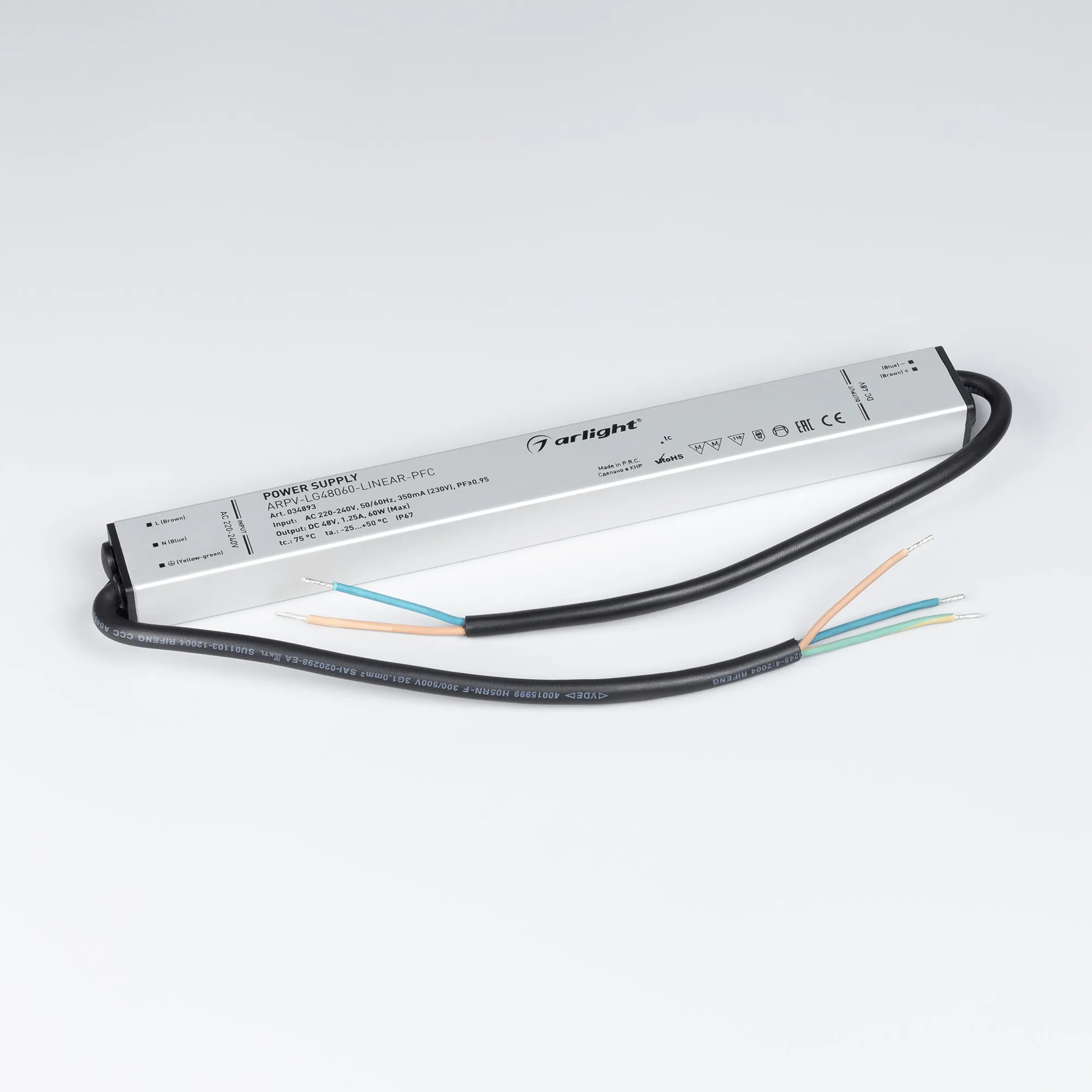 Источник напряжения с гальванической развязкой для светодиодных изделий. Входное напряжение 220-240 VAC. Выходные параметры: 48 В, 1.25 А, 60 Вт. Встроенный PFC >0.95. Тонкий металлический корпус IP67. Вход: 220-240VAC. Выход: 48VDC. Размер 290х30х21 mm.. Совместимость со стандартом EMC. Гарантия 5 лет. Допускается использование только внутри помещений.