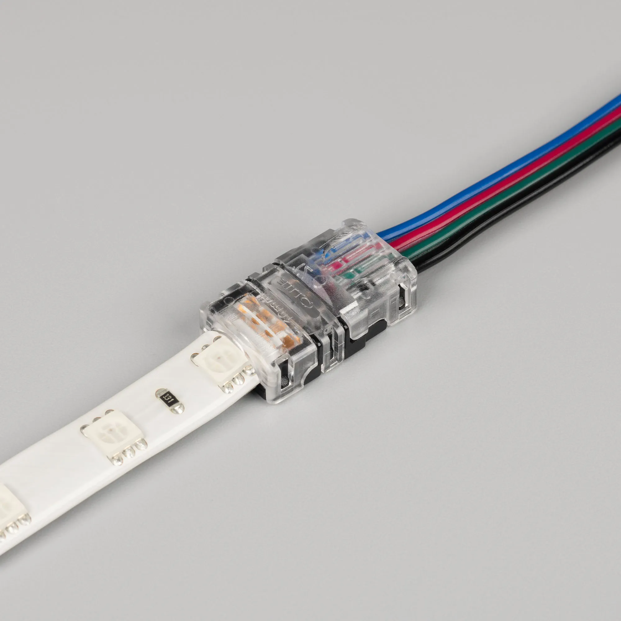 Одиночный коннектор (без провода) для подключения питания к герметичным (IP54/IP65) RGB лентам SE (заливка силиконом сверху) шириной 10 мм. Очистка провода питания (0,5-1,0 мм2) от изоляции не требуется. Материал - прозрачный пластик. Максимальный допустимый ток 3 А, напряжение 3-24 В, степень защиты IP55. Цена за 1 шт.
