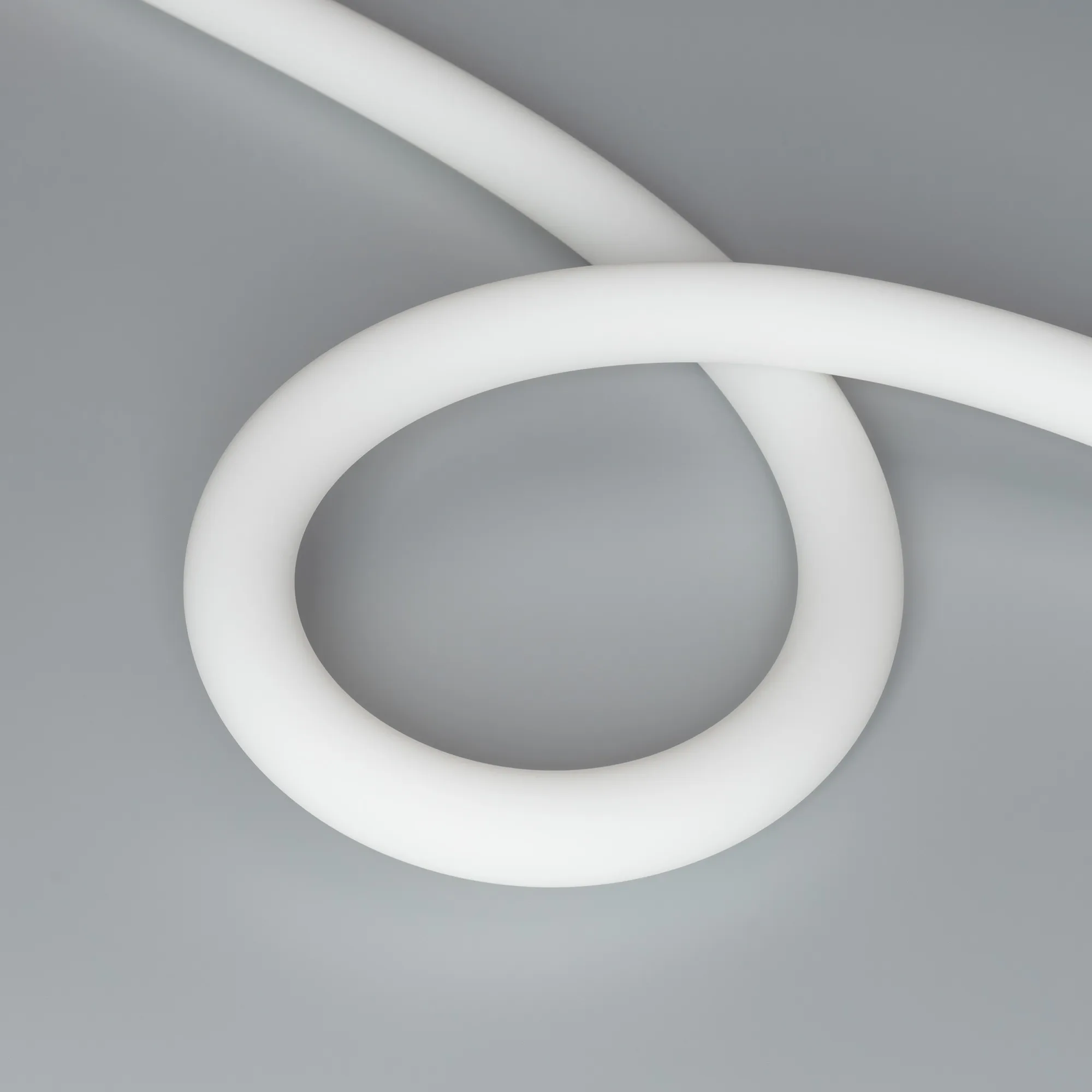 Гибкая герметичная лента (неон серии MOONLIGHT), сечение 25×25 мм. Светодиоды CSP 1088 шт/м. Цвет свечения ДНЕВНОЙ БЕЛЫЙ (4000 К), индекс цветопередачи CRI>90, световой поток 1140 лм/м, угол излучения 360°. Мощность 20 Вт/м, питание 24 В. Класс пылевлагозащиты IP65. Размеры 5000×25×25 мм. Резка не предусмотрена. Форма изгиба ленты фиксируется. Изгиб согласно метки на корпусе, минимальный радиус изгиба 150 мм. Кабель питания длиной 500 мм, вывод с одной стороны перпендикулярно линии сечения неона. Катушка 5 м. Цена за 1 м. В виду особенности конструкции ленты, упаковка имеет размеры 1600x980x260 мм. Гарантия 3 года.