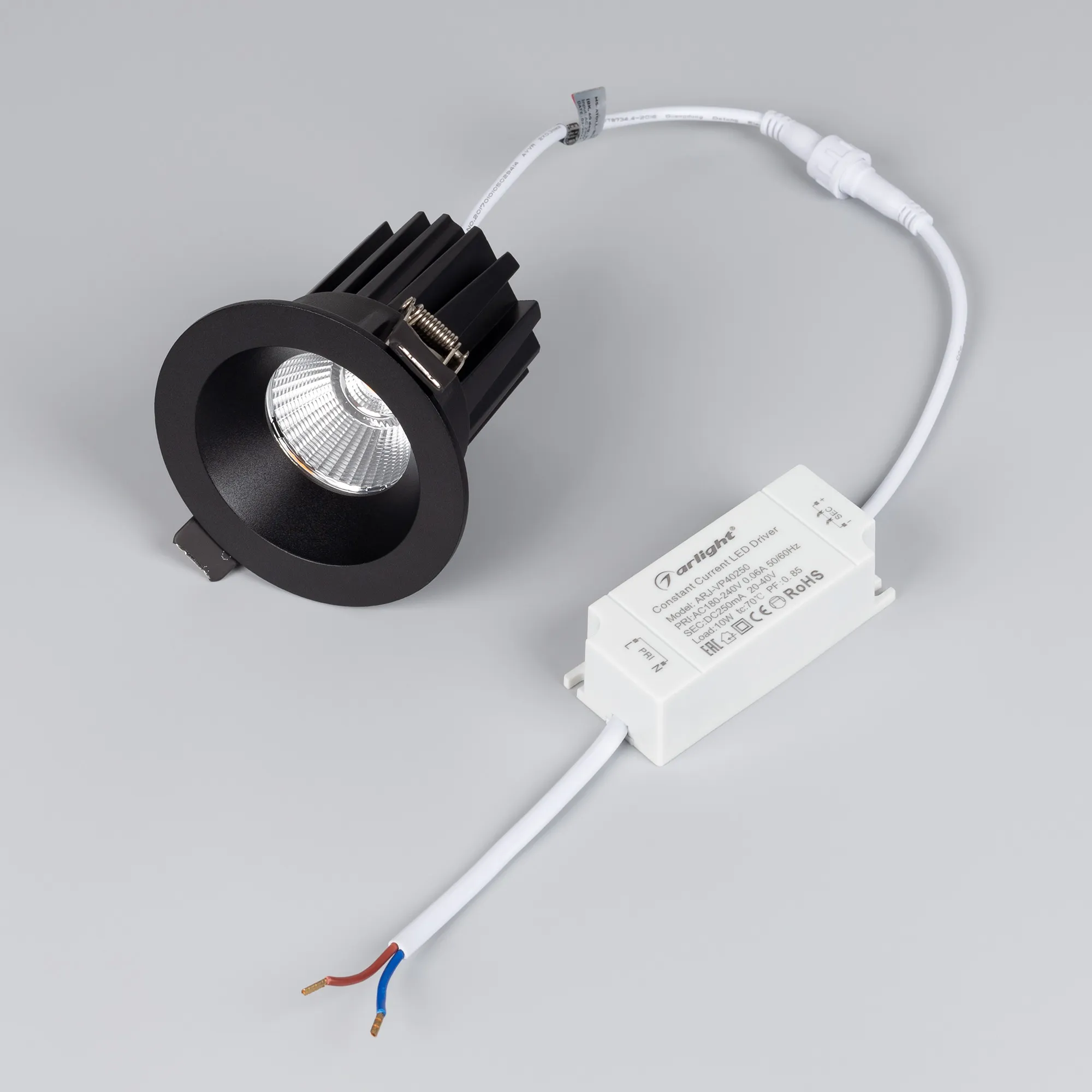 Встраиваемый светильник даунлайт. Мощность 10 Вт, св. поток 750 лм, 75 лм/Вт, тёплый 3000 K, CRI>90, угол 36°, напряжение питания 230 В. Чёрный круглый корпус из алюминия, экран PMMA, степень защиты IP54. Размер: диаметр 86 мм, высота 80 мм. Монтаж встраиваемый, установочное отверстие: диаметр 80 мм. Драйвер IP54, 20-40 В, 250 мА, пульсация <1%.