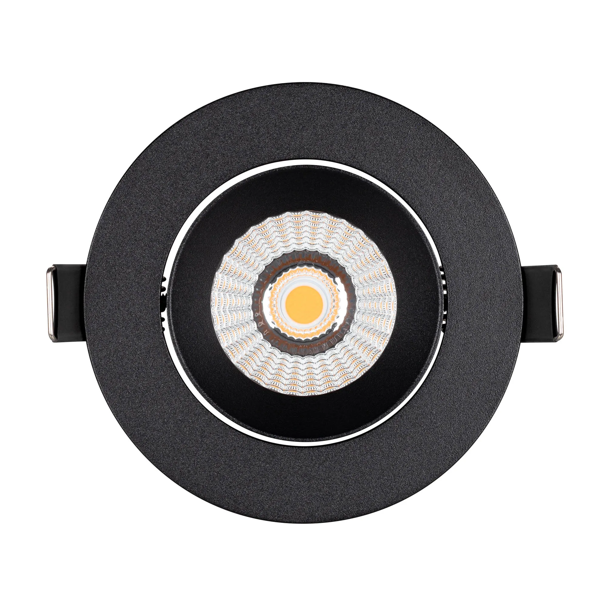 Встраиваемый поворотный светильник даунлайт. Мощность 10 Вт, св. поток 910 лм, 90 лм/Вт, дневной 4000 K, CRI>90, угол 60°, напряжение питания 230 В. Чёрный круглый корпус из алюминия, экран PMMA, степень защиты IP54. Размер: диаметр 94 мм, высота 75 мм. Монтаж встраиваемый, установочное отверстие: диаметр 77 мм. Драйвер IP54, 20-40 В, 250 мА, пульсация <1%.