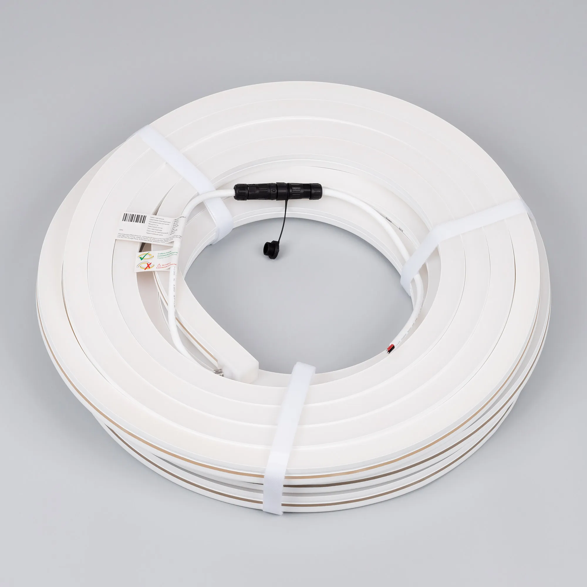 Гибкая герметичная лента (неон серии MOONLIGHT), сечение 20×20 мм. Светодиоды CSP 280 шт/м. Цвет свечения ТЕПЛЫЙ (2300К), индекс цветопередачи CRI>90, световой поток 370 лм/м, угол излучения 114°. Мощность 10 Вт/м, питание 24 В. Класс пылевлагозащиты IP67. Размеры 15000×20×20 мм. Мин. отрезок 50 мм. Горизонтальный изгиб SIDE, минимальный радиус изгиба 60 мм. Катушка 15 м. Цена за 1 м. Гарантия 5 лет.