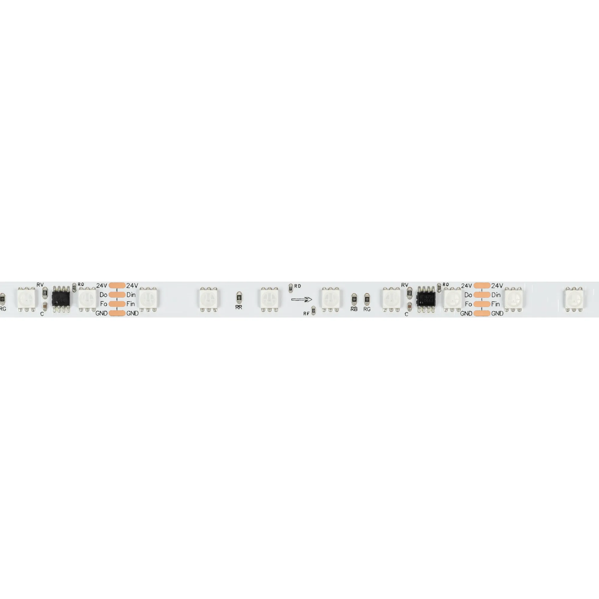 Светодиодная лента SPI серии B60 с микросхемой MT1808A. Светодиоды SMD 5060, 60 шт/м, 10 pixels на 1 м (50 pixels на 5 м), 1 pixel = 6 светодиодов, белая плата шириной 10 мм, скотч 3М. Цвет RGB, угол 120°. Питание 24 В, мощность 12 Вт/м (60 Вт на 5 м). Размеры 5000x10x1.8 мм. Мин. отрезок 100 мм, 6 светодиодов. Цена за 1 м.