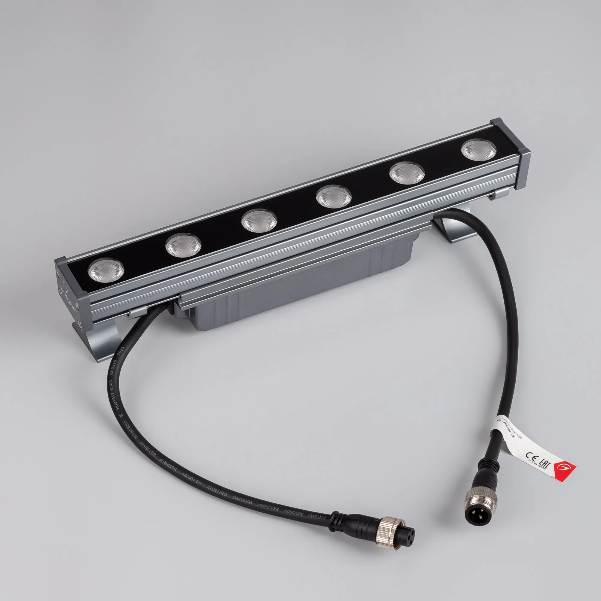 Линейный прожектор. Мощность 6 Вт, св. поток 480 лм, 80 лм/Вт, тёплый 2700 K, CRI>80, угол 30°, напряжение питания 230 В. Серый прямоугольный корпус из алюминия, экран стекло, степень защиты IP65. Размер: длина 300 мм, ширина 40 мм, высота 30 мм. Монтаж на кронштейнах.