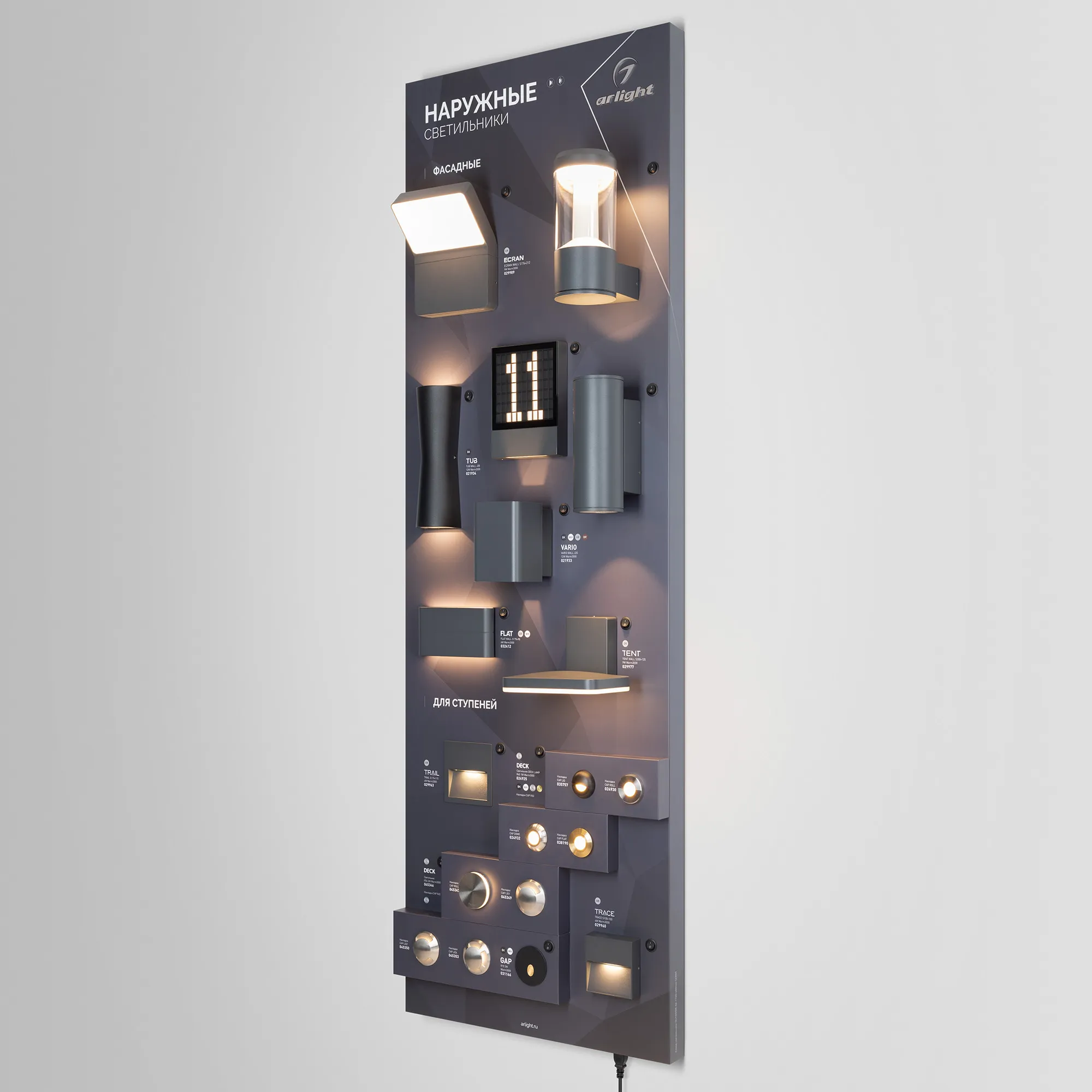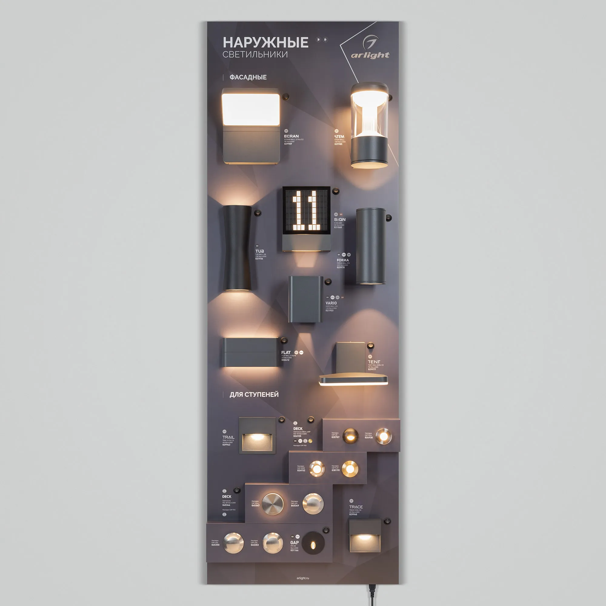 Стенд НАРУЖНОЕ ОСВЕЩЕНИЕ. Фасадные серии - SIGN, STEM, ECRAN, TUB, FORMA, VARIO, WALL FLAT, TENT , для ступеней - TRAIL, DECK, TRACE, GAP.