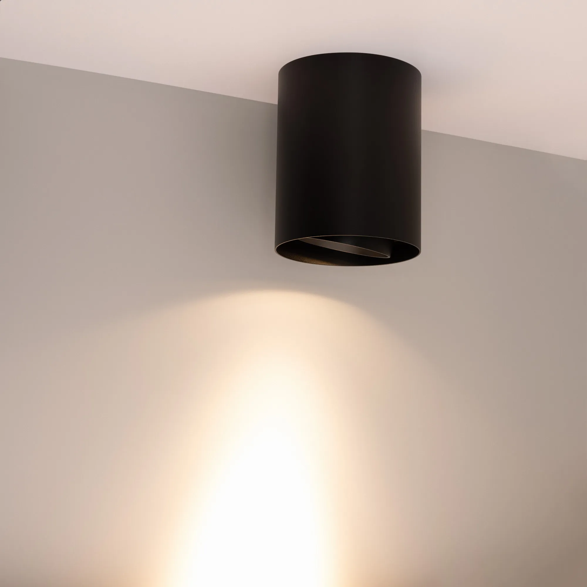 Накладной интерьерный светильник. Мощность 24 Вт, св. поток 2400 лм, 99 лм/Вт, теплый 3000 K, CRI>90, угол 15°, регулируемое направление луча 40°(20+20), поворотный световой модуль вокруг своей оси на 340°, UGR <11, напряжение питания 230 В. Чёрный круглый корпус из алюминия, степень защиты IP54. Размер: диаметр 132 мм, высота 165 мм. Монтаж накладной. Драйвер 27-45 В, 600мА, пульсация <1%.