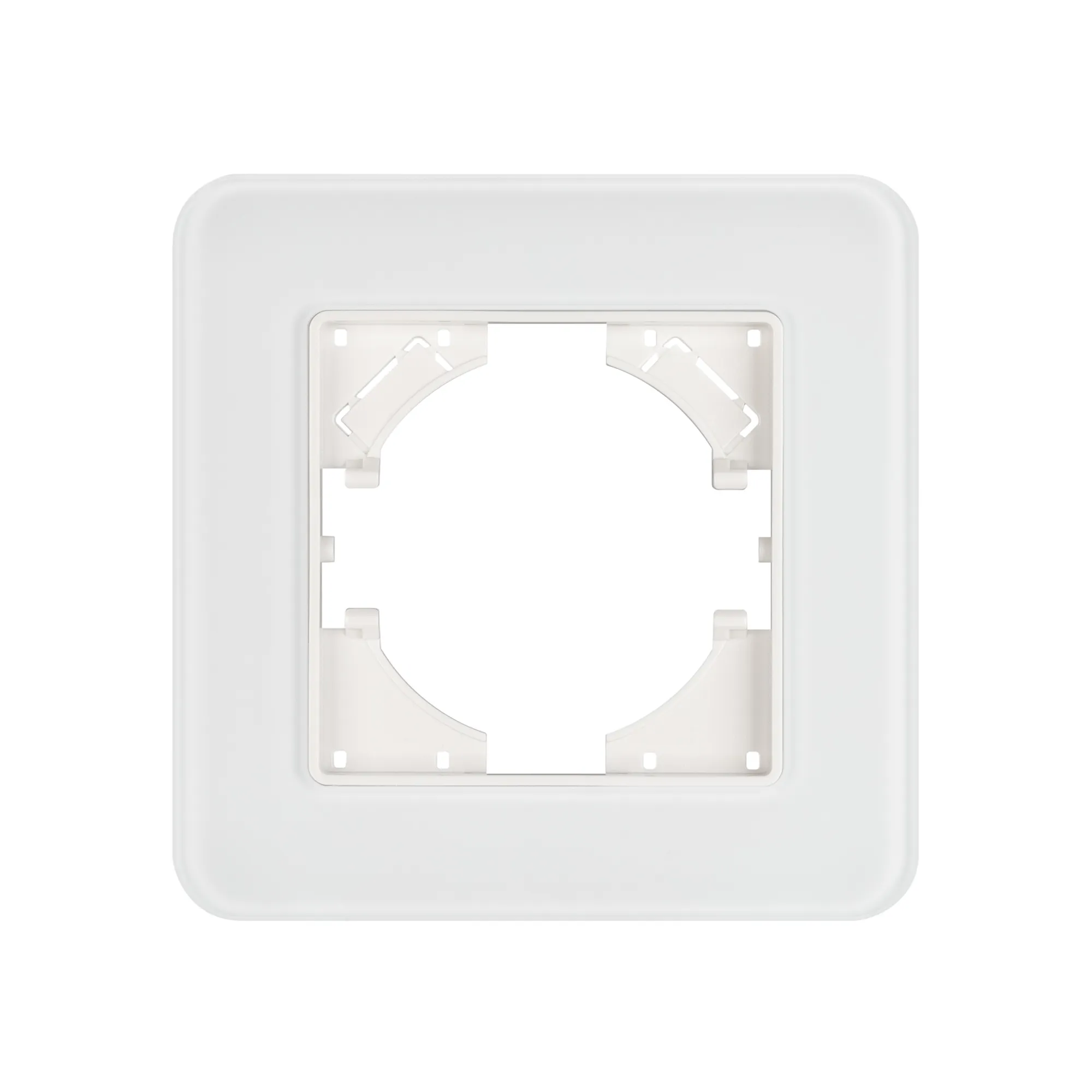 Рамка стеклянная на 1 пост, под встраиваемый механизм. Цвет - белый с Soft-Touch покрытием. Среднего уровня герметичности IP20. Ориентация монтажа - горизонтальная (основным ориентиром служат посадочные выступы для накладки механизма).