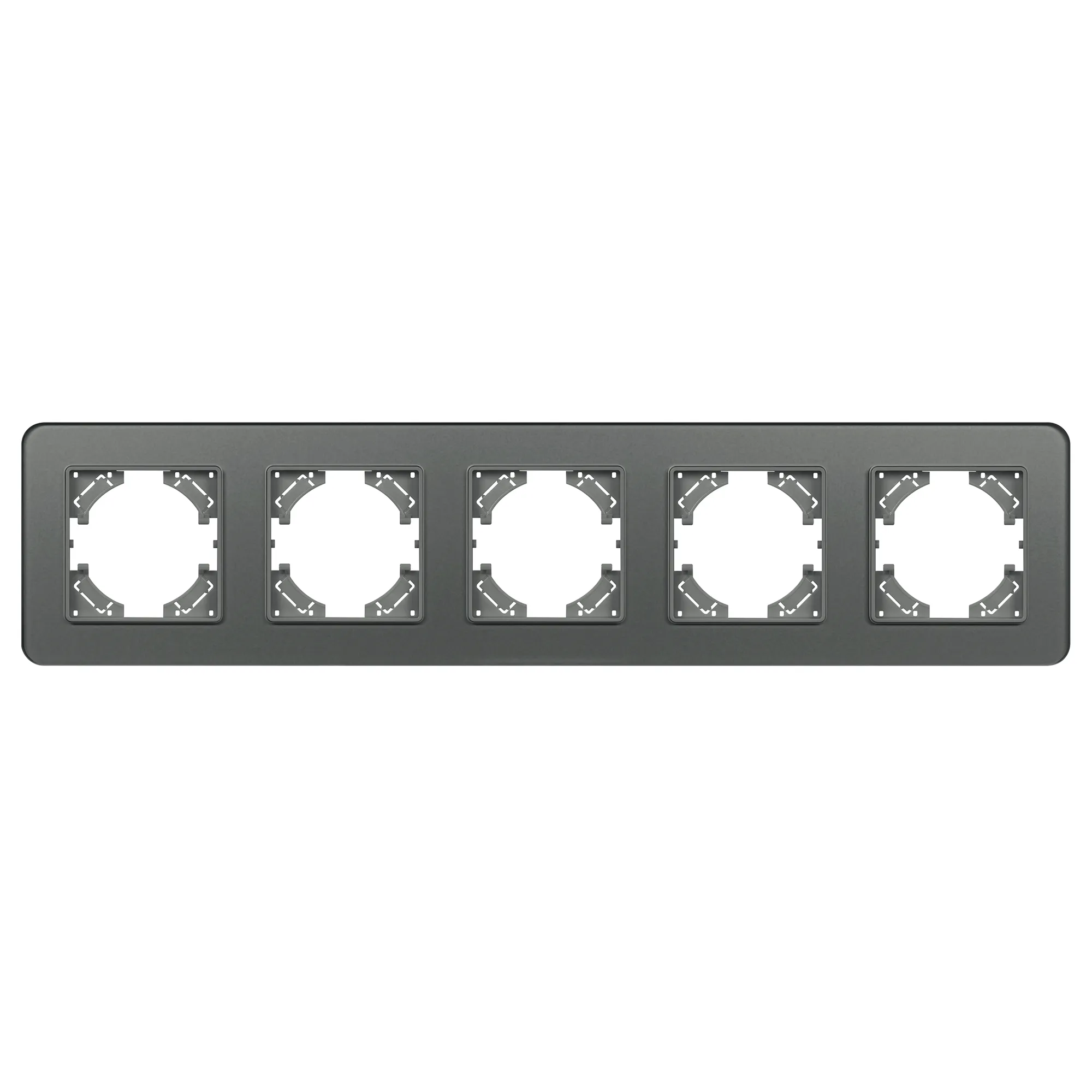 Рамка стеклянная на 5 постов, под встраиваемый механизм. Цвет - серый с Soft-Touch покрытием. Среднего уровня герметичности IP20. Ориентация монтажа - горизонтальная (основным ориентиром служат посадочные выступы для накладки механизма).