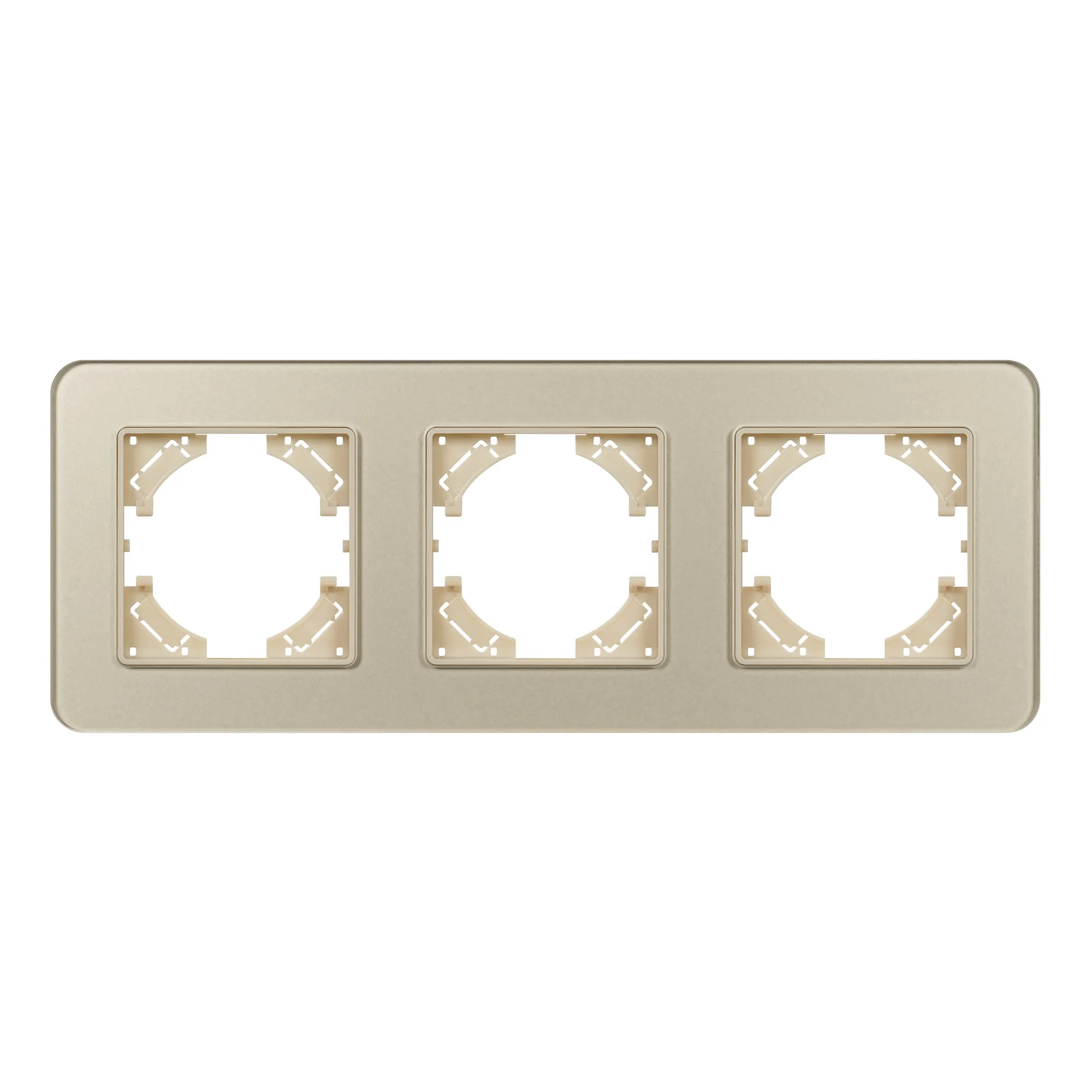 Рамка стеклянная на 3 поста, под встраиваемый механизм. Цвет - золотой с Soft-Touch покрытием. Среднего уровня герметичности IP20. Ориентация монтажа - горизонтальная (основным ориентиром служат посадочные выступы для накладки механизма).