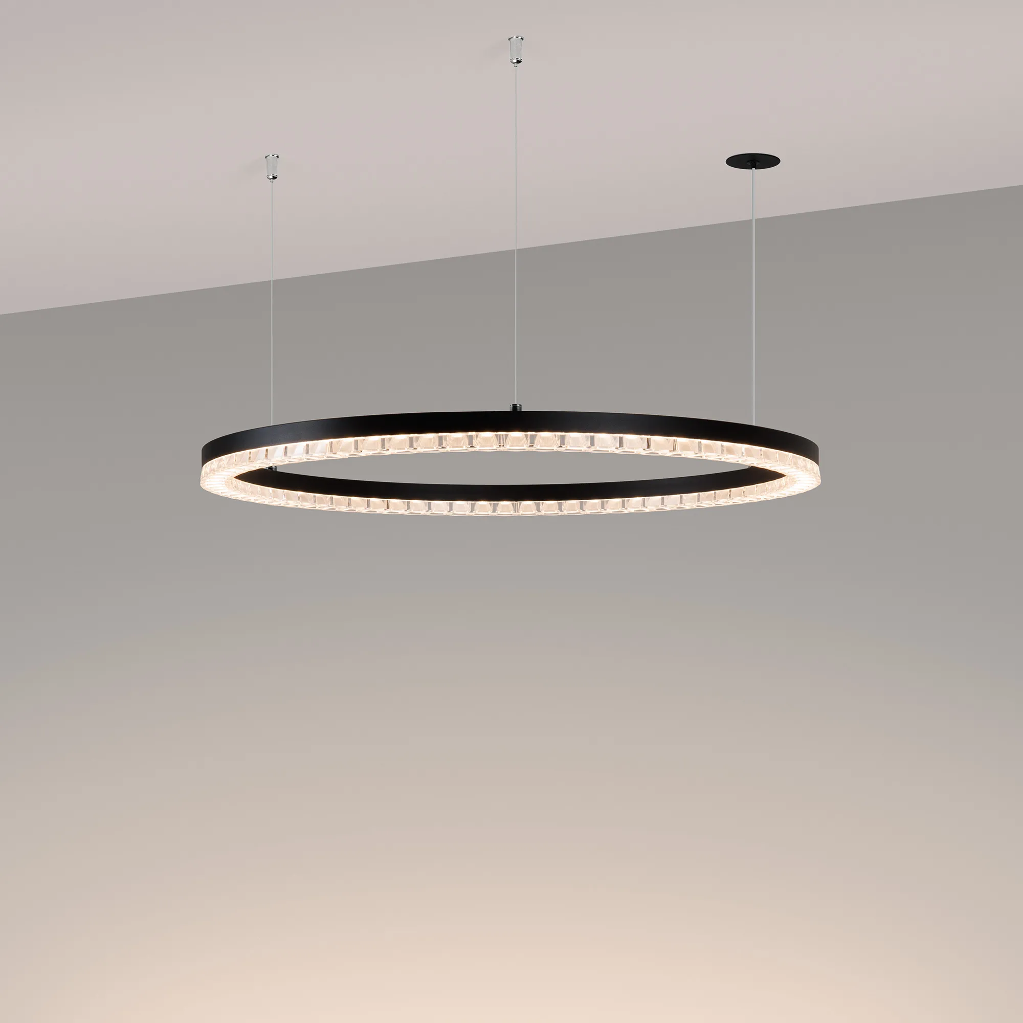 Подвесной светильник. Мощность 36 Вт, св. поток 2900 лм, 80-95 лм/Вт, теплый 3000K, CRI>90, угол 45°, напряжение питания 230 В. Чёрный круглый корпус из алюминия, экран PMMA, степень защиты IP20. Размер: диаметр 650 мм, высота 34 мм, ширина профиля 30 мм, размер чаши: диаметр 65 мм, высота 26 мм. Монтаж подвесной, длина подвеса 1200 мм, тип чаши встраиваемый, диаметр установочного отверстия чаши 60 мм. Драйвер 27-38 В, 1050 мА. Пульсация <0,3%.