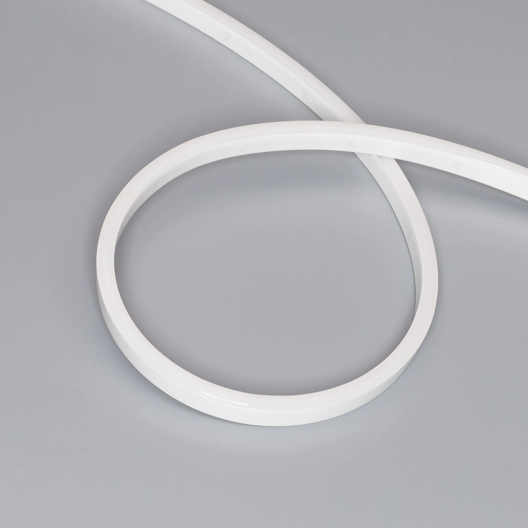 Гибкая герметичная лента (неон серии WAVE), сечение 06×12 мм. Светодиоды SMD2835 120 шт/м. Цвет свечения ТЕПЛЫЙ БЕЛЫЙ (3000 K), индекс цветопередачи CRI>90, световой поток 398 лм/м, угол излучения 125°. Мощность 8 Вт/м, питание 24 В. Оболочка из Полиуретана (PU). Класс пылевлагозащиты IP68. Размеры 5000×06×12 мм. Не подлежит резке. Горизонтальный изгиб SIDE, минимальный радиус изгиба 30 мм. Катушка 5 м. Цена за 1 м. Гарантия 3 года.