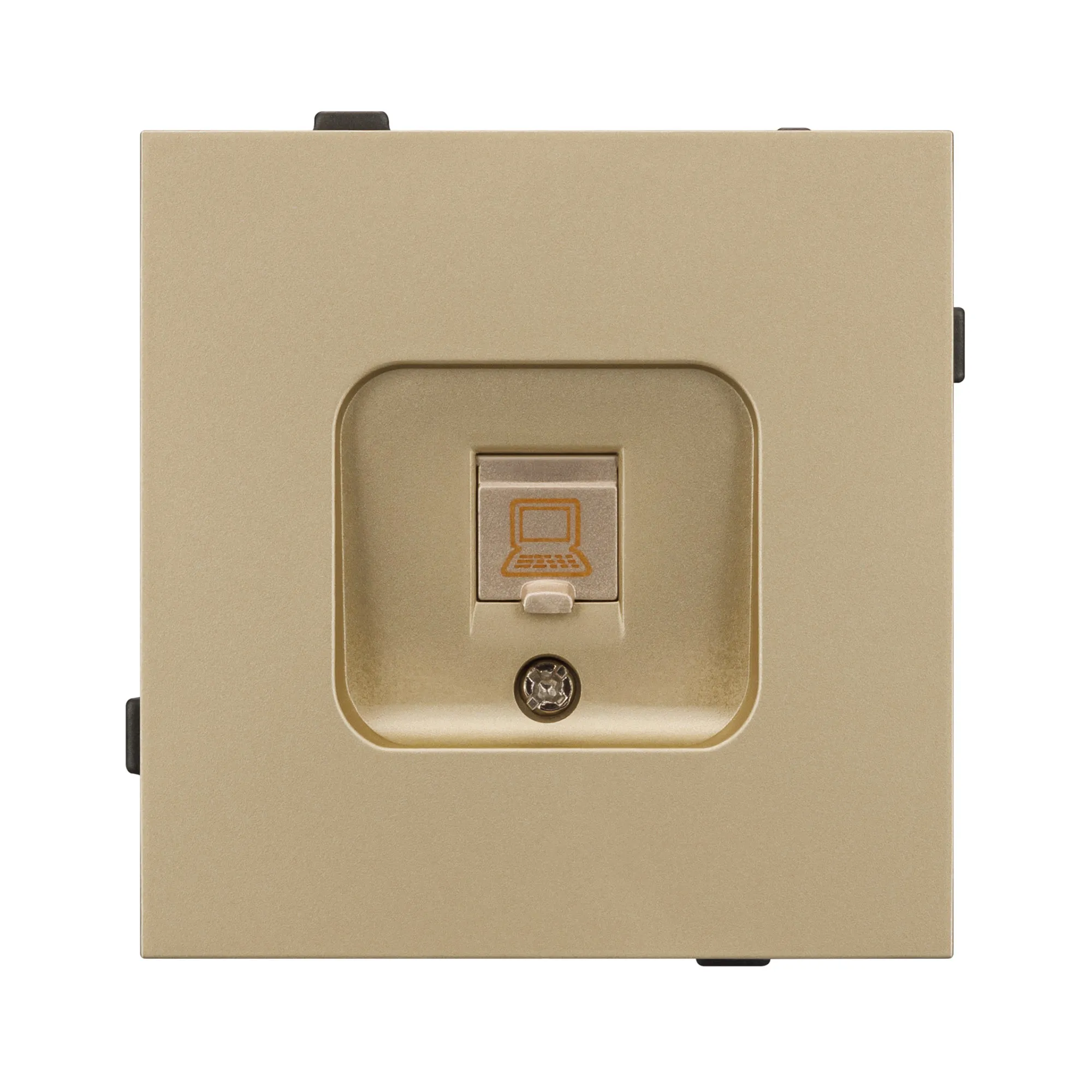 Механизм компьютерной розетки на 1 пост 6-й категории. Цвет - золотой, с Soft-Touch покрытием. Без фронтальной рамки. Уровень пылевлагозащиты IP20. Розетка устанавливается в стандартный подрозетник круглого сечения диаметром 60мм.